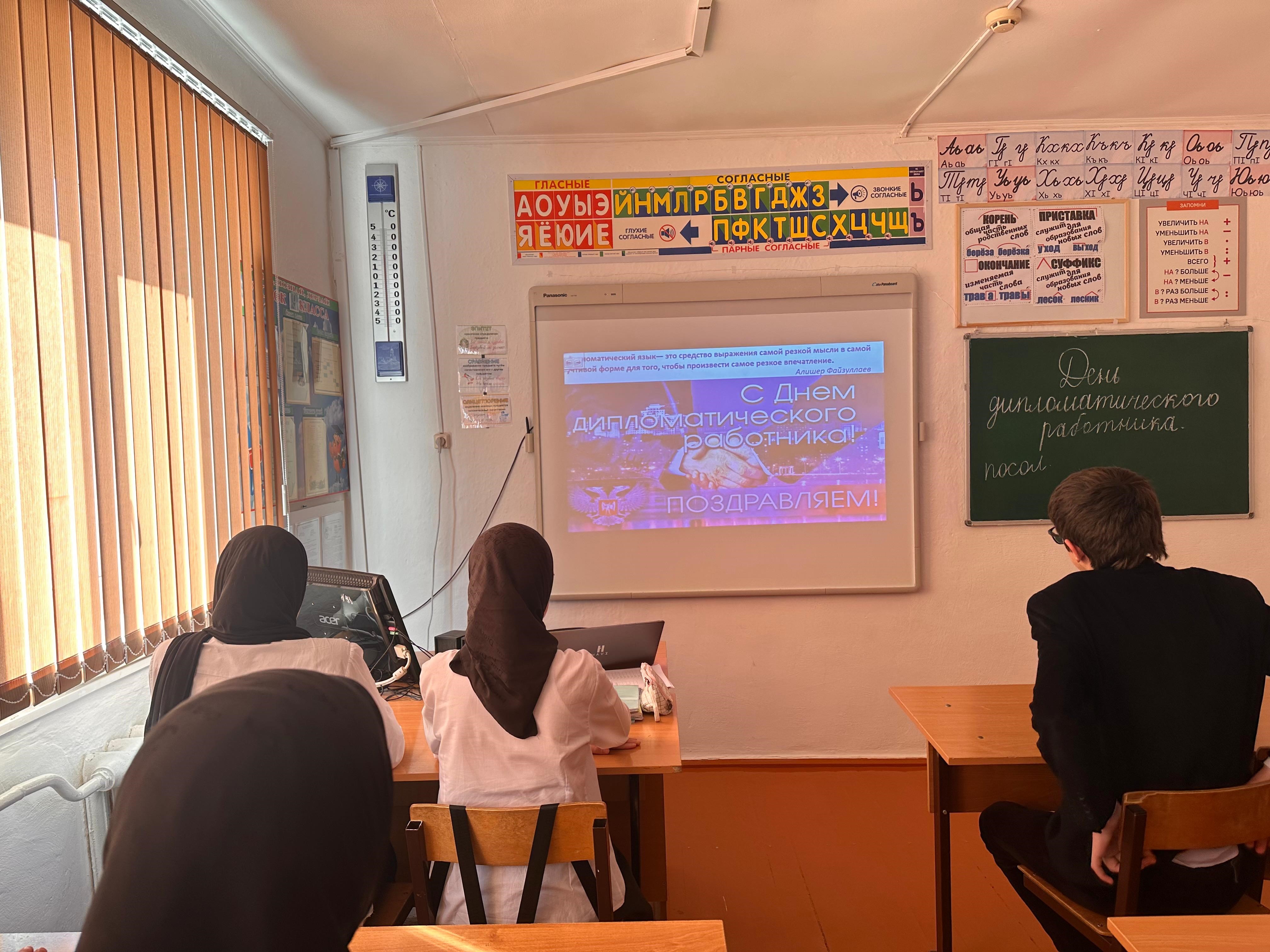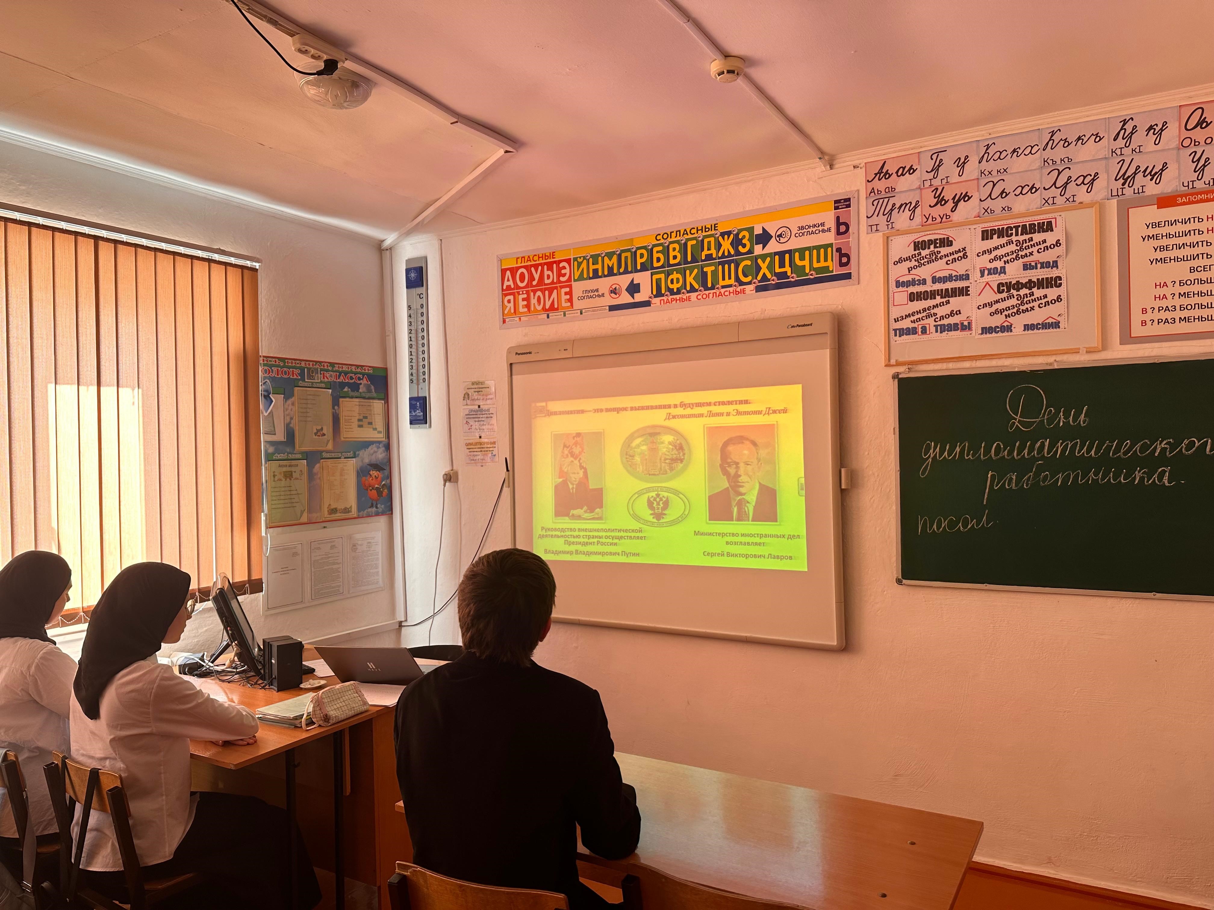 Во взаимодействии с отделом в Ножай-Юртовском районе УФСБ России по Чеченской Республике 10.02.2025г. зам по ВР проведен классный час, приуроченный Дню дипломатического работника.