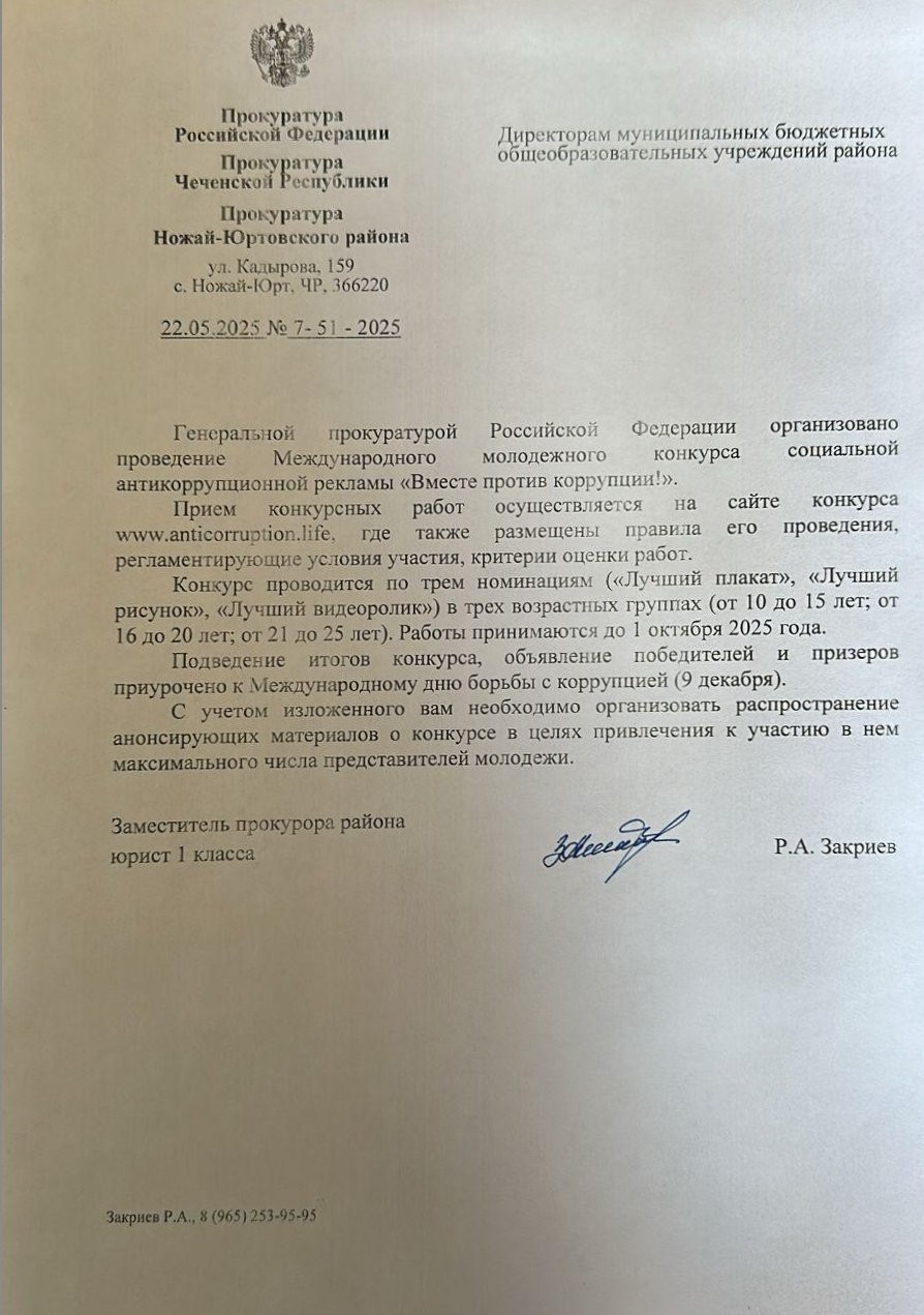22.05.2025Генеральной прокуратурой Российской Федерации организовано проведение Международного молодежного конкурса организовано социальной антикоррупционной рекламы «Вместе против коррупции!».Прием конкурсных работ осуществляется на https://anticorruption.life где также размещены правиласайте конкурса его проведения,регламентирующие условия участия, критерии оценки работ. Конкурс проводится по трем номинациям («Лучший плакат», «Лучший рисунок», «Лучший видеоролик») в трех возрастных группах (от 10 до 15 лет; от 16 до 20 лет; от 21 до 25 лет). Работы принимаются до 1 октября 2025 года. Подведение итогов конкурса, объявление победителей и призеровприурочено к Международному дню борьбы с коррупцией (9 декабря).С учетом изложенного вам необходимо организовать распространение анонсирующих материалов о конкурсе в целях привлечения к участию в нем максимального числа представителей молодежи.